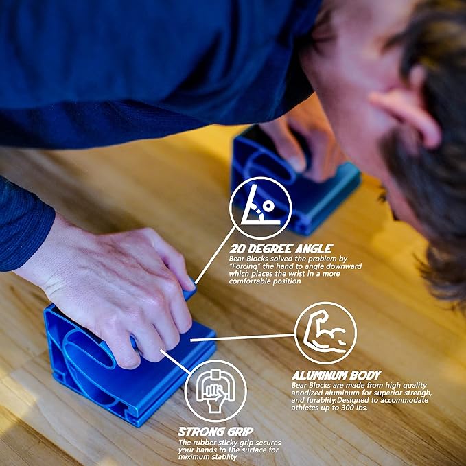 - FLAT PALMS: Bear Blocks Push Up handles for men and women spread weight across a flat palm with an active, strong grip to reduce pressure point pain on palms from a regular pushup board or pushup bar.